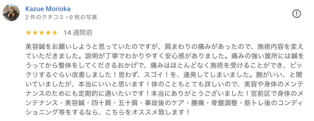 「先生がとても丁寧に話を聞いてくださり、痛みの原因を明確にわかりやすく説明してくれました。今まで色々な所へ行きましたが、ここまで自分の体について納得できたのは初めてです!そして、なんと施術も驚くほど体が軽くなり、先生の人柄も含めて本当に信頼できる場所に出会えました。」